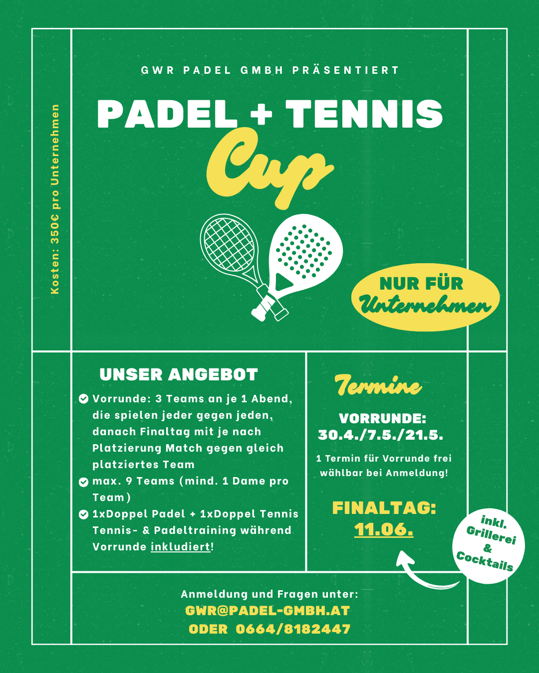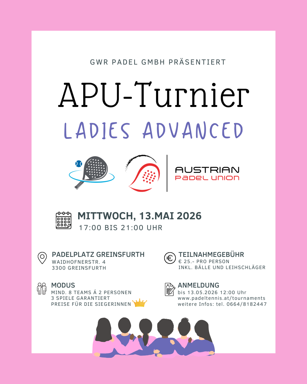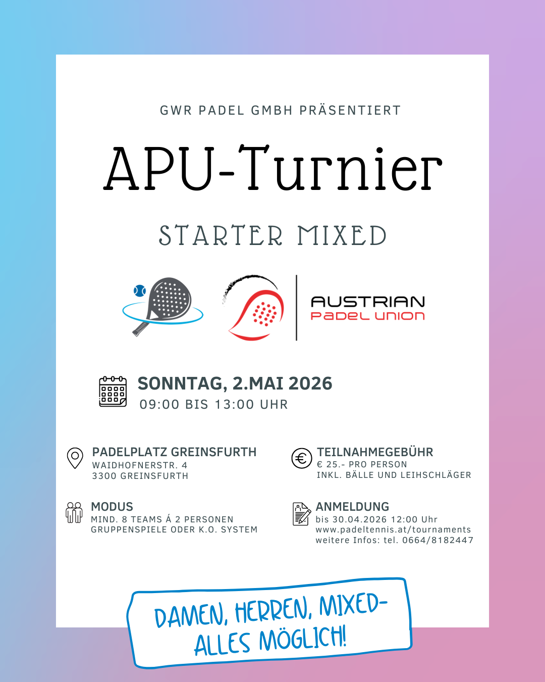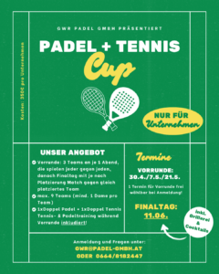 Wir organisieren die meisten unserer Turniere in Zusammenarbeit mit der Austrian Padel Union (APU). Das bedeutet, du hast die Möglichkeit, offizielle Ranglistenpunkte zu sammeln und dich mit Padel-Spielern aus ganz Österreich zu messen. Melde dich jetzt an und zeig, was du drauf hast!